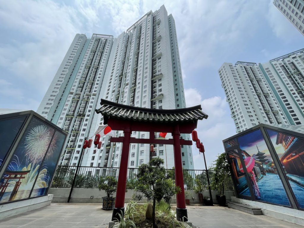 内装も日本のイメージである富士山などの景色の写真を壁にあしらい、屋上には赤鳥居も設けた。