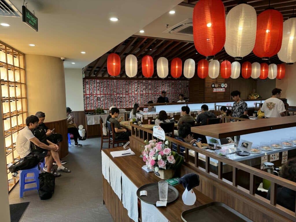 2025年6月、ハノイに「スシタイガー」が出店した。「スシタイガー」とはホーチミン市タイバンルンの路地うらにある、立ち食いスシバーだ。超人気店でふらっと通りがかりにでも立ち寄りたいが、店内は常にいっぱいで入店そのものができない。それほどの人気店だ。外壁には黄色のビールケースを用い、のれんに染め抜かれたロゴマークの虎の顔の絵も印象的だ。