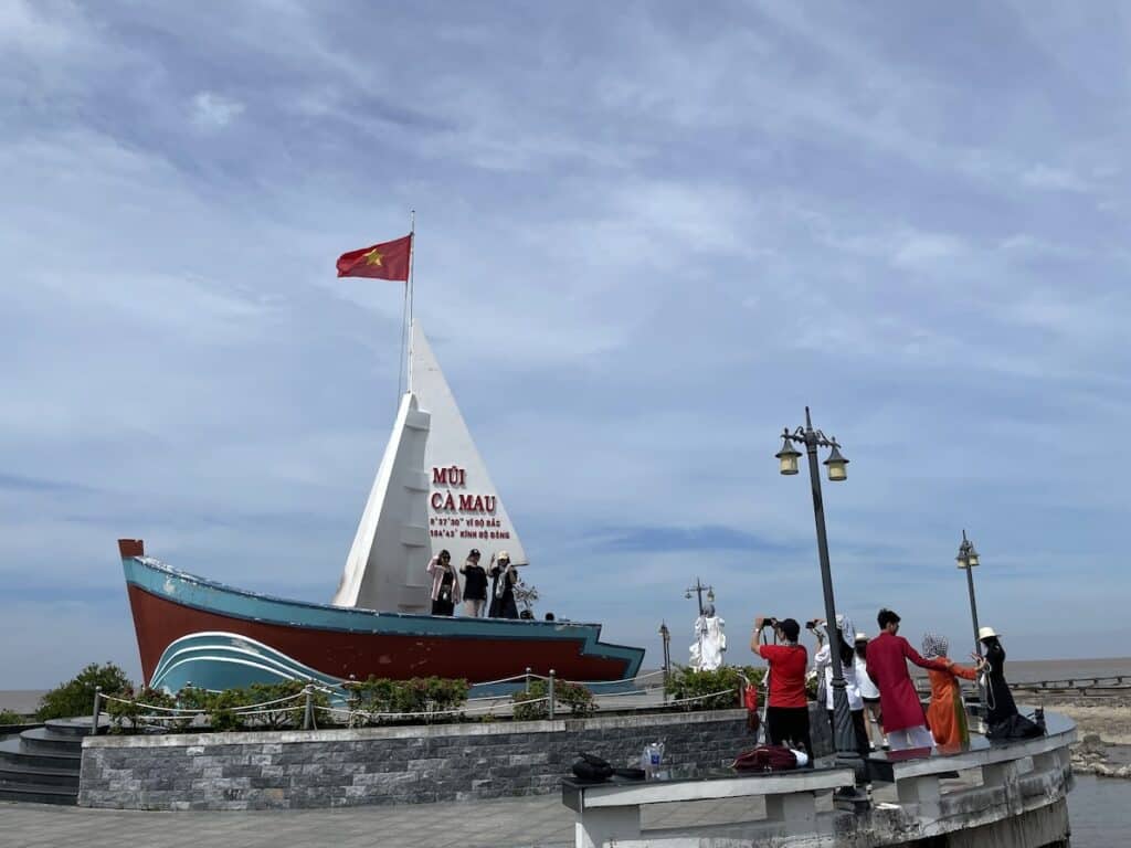岬の最南端にはベトナム国旗はためく帆船を模した記念碑が、ベトナムの最南端であることを教えてくれます。カマウ名物のカニの大型のモニュメントやフラッグタワーがあり、タワーに昇ってマングローブの林を一望することができます。