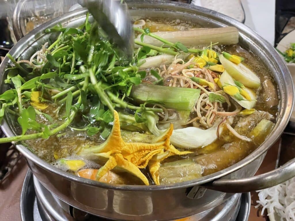 またカントーにきたらぜひ食べてほしいのが「ラウマム」鍋です。マムという魚を発酵させてつくった調味料の入った鍋汁にメコンデルタの淡水魚や白菜、空芯菜、ニラに加えて、ディエンディエンやスードゥアといったお花をあしらった鍋があります。汁にちょっとクセがあるものの、メコン川の豊かさを実感できる鍋です。黄色や白の花の色がアクセントの花を食べる鍋です。