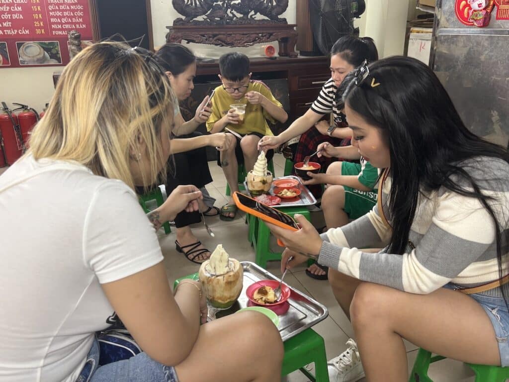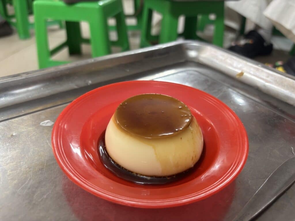 見るからにローカル感溢れる店内には、決められたテーブルや席がありません。ベトナムの飲食店でよく見かける、赤や緑の背の低いプラスチック製の椅子が乱雑に転がっており、お客さんはまずは座る用とテーブル用の椅子を自ら選び、自らスペースを確保しなくてはなりません。席に着く頃を見計らって、店員さんが注文を取りに来てくれます。周りのベトナム人を見ると、ヨーグルトやチェー(ベトナム風ぜんざい。詳細はこの後の章で説明)を頼んでいる人もいますが、お店の看板メニューである“カラメン”は外せません。“カラメン”とは、ベトナム語でカスタードプリンのこと。個人的な感想になりますが、日本のプリンよりも若干柔らかめでさっぱりした味なので、甘党でない私でも軽く2〜3個はいけます。こんな美味しいプリンが1個8,000VND(約45円)というのだから、お土産や持ち帰りに1人10個以上買って行く人がいるのも納得です。もう1軒のプリン屋も目と鼻の先にありますので、2軒をはしごして、食べ比べするのも良いでしょう。