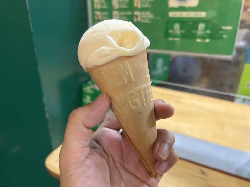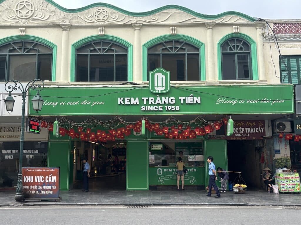 ホアンキエム湖の南、チャンティエン通りにある1958年創業の老舗アイスクリーム店「ケムチャンティエン」。大きな緑色の看板が特徴的で、市内を走る2階建観光バスのルート上にあることから、1度観光でハノイを訪れたことがある方なら、写真を見て「あのお店!」と思い出す方も多いことでしょう。市内にいくつも支店がありますが、本店は地元ハノイっ子や観光客でいつも混雑しています。表通りに面したカウンターでも購入可能ですが、せっかくですので、お店の奥まで進んでみましょう。
